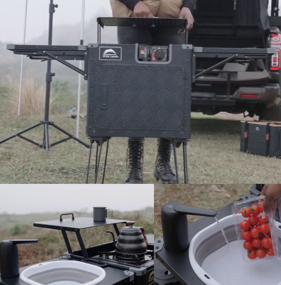The Kitchen Cruiser comes with a prep station, integrated stove, and basin. It has a space grade aluminum construction with removable legs. This kitchen also provides you with running water anywhere.