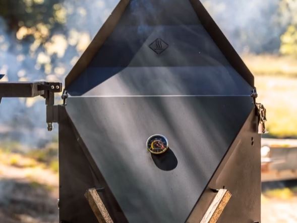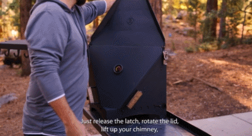 This is the KivaKube: a portable BBQ that functions as a smoker, grill, oven, stove, and fireplace using charcoal, gas, pellets, or wood as a fuel source. It is easy to use anywhere. You can set it up by releasing the latch, rotating the lid, and lifting the chimney up, and you are set. You can remove the charcoal Convertkit and insert your propane or pellet Convertkit.
