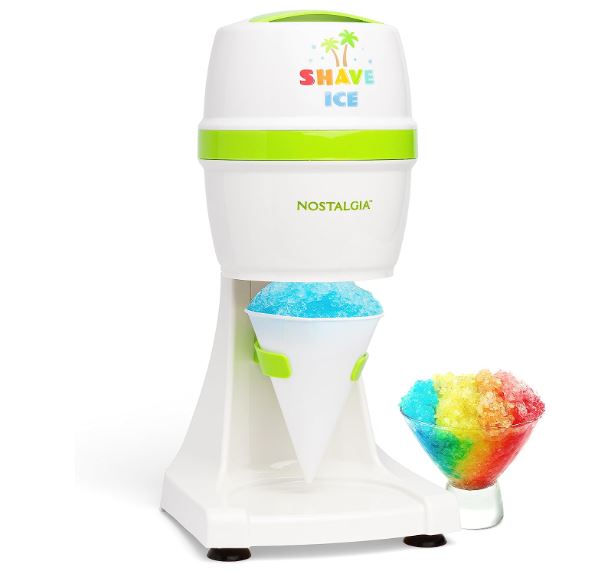 Meet the Nostalgia Snow Cone Shaved Ice Machine: a table-top slushie machine with stainless steel cutting blades to shave ice cubes into fluffy snow-like ice. It comes with a reusable snow cone and 2 ice molds. This shaved ice machine has a footprint of 7 x 7.5 x 14.5″.