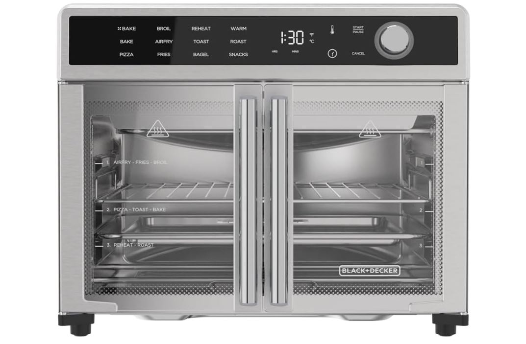 This oven has a digital control panel. It ships with an air fry basket, bake pan, and crumb tray. You will be able to monitor your food through its easy-view glass doors.