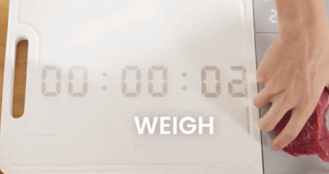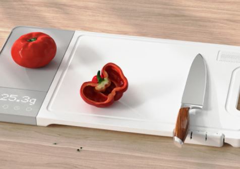 This is the ChoppingBot: a 5-in-1 cutting board that you can use to chop, time, and weigh your ingredients. You can also use it to sharpen your knife. It has a display that shows various units. This cutting board has a timer with 2 modes. It can count up and down.
