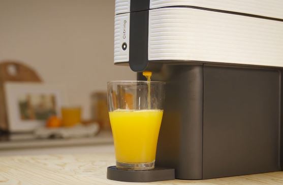 This is the Citring One: an automatic citrus juicer that saves you time preparing healthy drinks for your family. It has a platinum silicone container that you can use to store 3 oranges. Simply press the main button and the rest is easy. This award winning juicer has a noise rating of 63dBa.