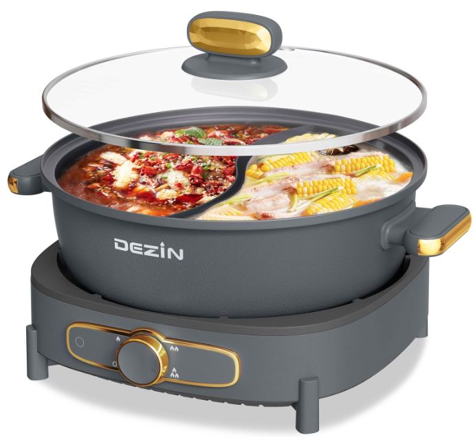 This is the Dezin Electric Hotpot Pot: a 5L shabu shabu pot that lets you make 2 flavors of your favorite meals. It has a non-stick removable pot. It has 3 adjustable settings, including slow-cook, stir-fry, and steam. It has a max power of 1350W.
