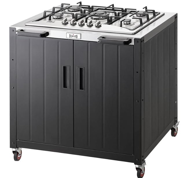 This is the Feasto Movable Outdoor Gas Stove: a nifty gas grill with 5 burners that you can use to prepare your meals outside. It has 36,200 BTUs output. It has plenty of space in the left side cabinet for storage. This stove comes with 4 casters, so you can move it around.