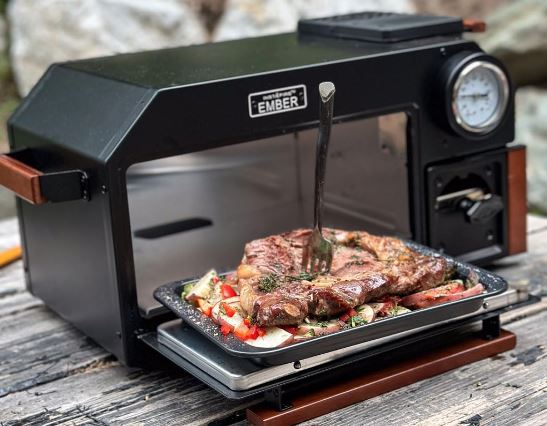 This is the InstaFire Ember Oven: an off-grid oven that lets you cook with wood chips, twigs, and charcoal. It has 470 cubic inches capacity. It weighs only 17.5lbs, so you can easily move it around. This oven has a cold-rolled steel fused with aluminum.