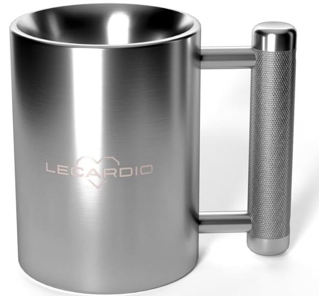 Here is a fitness mug weighing 18lb that gives you a bit of workout as you have a drink. The Lecardio Fitness Mug has a food-grade stainless steel construction. It has 300ml volume with a knurled handle. The handle has a strong connection, so it won’t break easily. It gives you a comfortable grip.