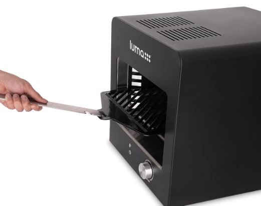 This is the Luma Electric Steak Grill: a countertop grill that you can use to cook all kinds of meats fast. It is 1800W rated and can reach temperatures up to 1450F. It has a knob that lets you adjust the temperature and time fast. You can use this oven to cook steak, chicken, fish, vegetables, or simply keep your food warm.