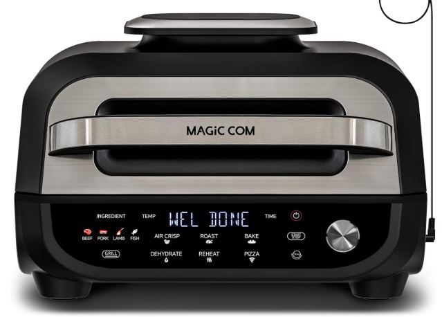 Meet the MAGiC COM Indoor Grill and Air Fryer: a 7-in-1 cooker that you can use to cook beef, pork, fish, pizza, and everything in between. It also has dehydrate and air crisp function. It has a tempreature probe to ensure your food is cooked at your desired doneness level. This ships with a grill basket, tray, plate, and an inner pan that has non-stick cooking. It has dishwasher safe parts for easy cleaning.