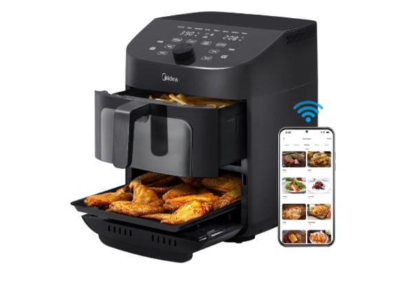 Air fryers are getting smarter all the time. The latest models have two baskets, allowing you to cook two meals simultaneously and have them finish at the same time. Take the Midea Dual Basket Air Fryer for instance: it is a WiFi connected air fryer oven with 11 quarts capacity and 8 functions. The upper basket has 6qt capacity while the lower one lets you fit 5qt of ingredients.