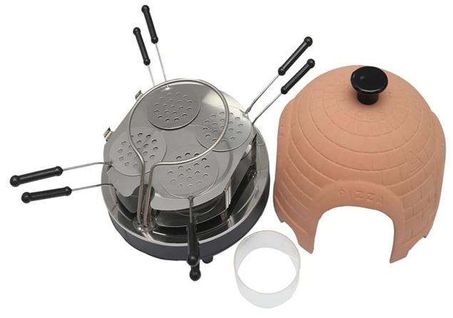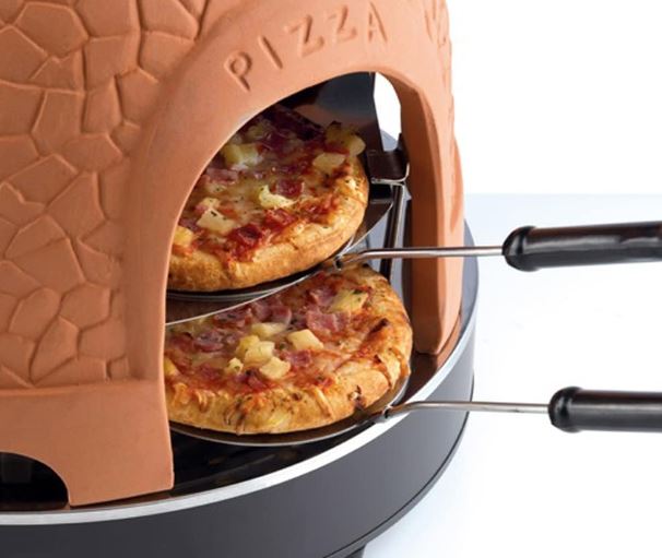 Here is another electric pizza oven that can make you authentic tasting pizzas at home. The NAMVI 2-Tier Terracotta Pizza Oven is 1000W rated. It lets you make 8 mini pizzas. It feature a large Terracotta cover. It has dual heating coils to get the job done. It has cooling holes at the bottom as well as non-slip feet.