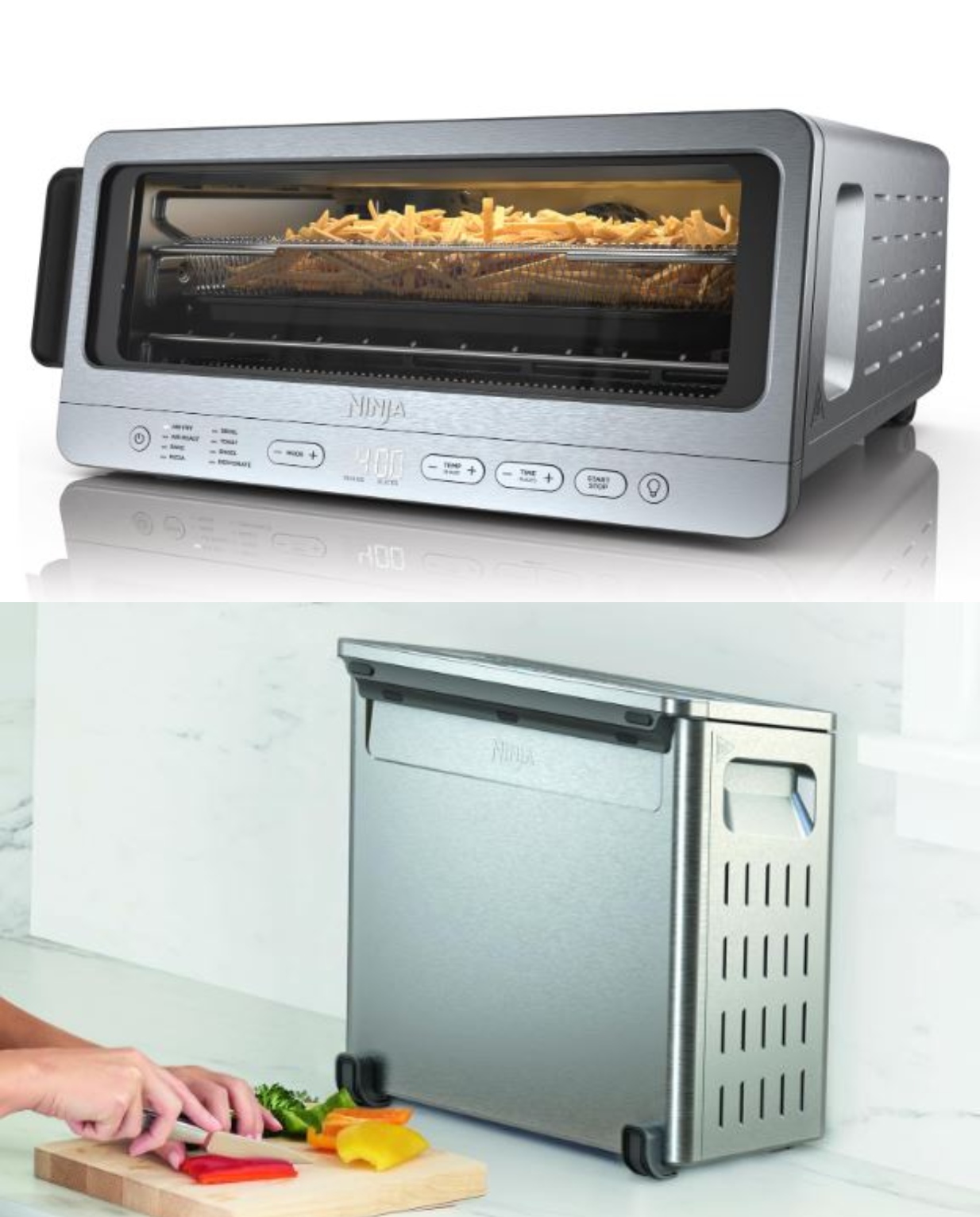 Here is a toaster oven and air fryer that you can flip up to store in tiny kitchens. The Ninja SP151 Flip Toaster Oven & Air Fryer has 8 functions. It has enough room for a 12-inch pizza and 6 chicken breasts. It has Air fry, Roast, Broil, Bake, Pizza, Toast, Bagel, and Dehydrate functions.