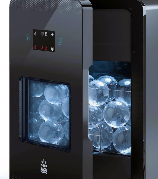 This machine has an insulated basket to keep your ice balls ready to go when you need them. It has a LCD touch control panel and indicator lights. It also has a light for easy access at night. These ice balls take about 3 hours to melt.