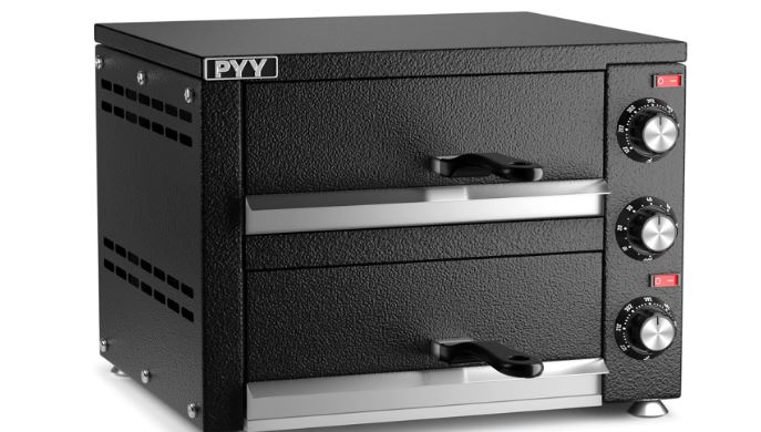This is the PYY Countertop Pizza Oven: an electric indoor pizza oven with two tiers that you can use to make 2 different pizzas at the same time. It has an adjustable temperature range of 0-572F. It can not only make 12-inch pizzas but also cakes, pies, pretzels, and chicken wings.