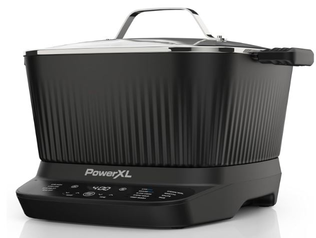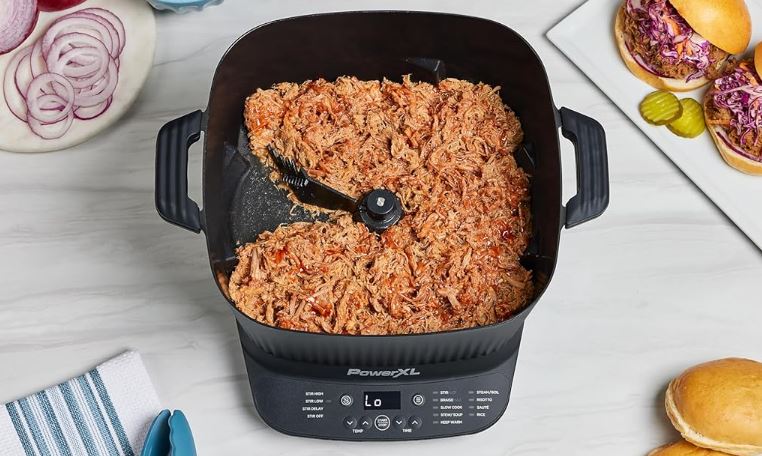 This is the PowerXL StirMax Digital Multi-Cooker: a 7.5qt capacity cooker with an automatic paddle that stirs and shreds your ingredients. It has 9 presets for you to choose from. This multicooker has 6lbs of pork and 2 chickens. The StirMax has a special Braisemax program that sears and browns your food first before simmering.