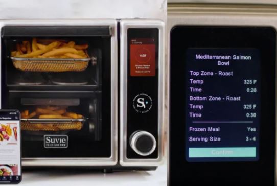 The Suvie 3.0+ has air fry and convection bake & roost modes. You can cook your own ingredients or buy ready to cook meals. This kitchen robot ships with 2 x food pans, 2 air fryer baskets, 2 sheet pans and a wire rack.