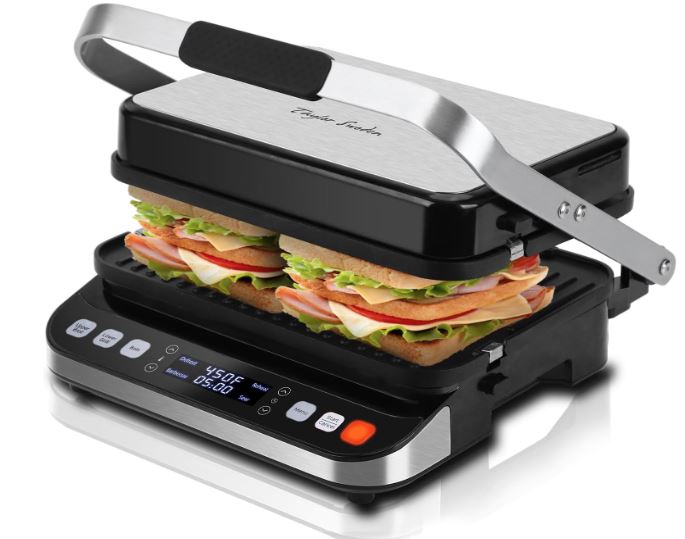 Here is an electric indoor grill with non-stick double sided plates that you can use to prepare all kinds of delicious lunches fast. The Taylor Swoden 10 in 1 Grill & Sandwich Maker has a LED touchscreen display with independent temperature control. It is 1600W rated and has adjustable temperature from 175 to 450F.