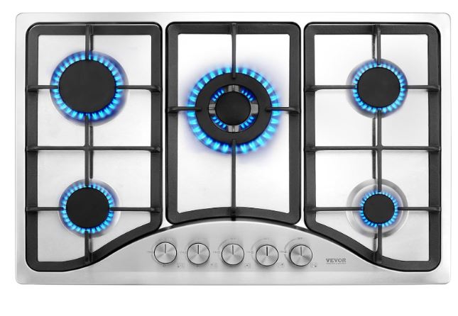 Here is a gorgeous cooktop that you can use in small apartments and RVs. The VEVOR 30-inch Gas Cooktop has 5 burners with different power levels (3750BTU, 2 x 6400BTU, 10200BTU, and 12250BTU. 12250BTU). You can use it to fry, simmer, steam, boil, and melt your food.