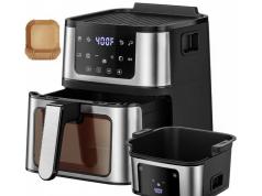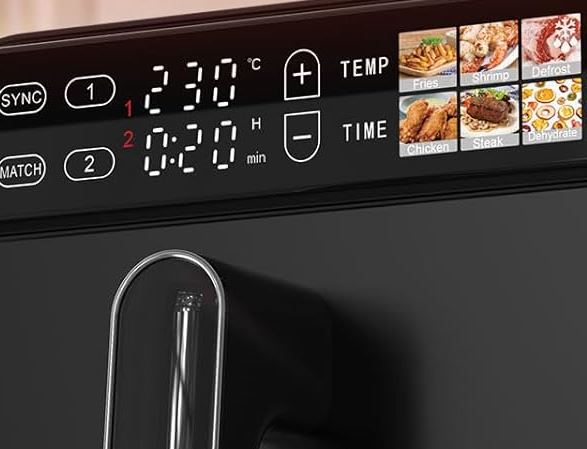 Here is a dual basket air fryer that you can use to cook two different meals at the same time. The WETIE Vertical Dual Basket Air Fryer has sync and match functions just like other air fryers in this class. It has dual independent 5.8qt baskets that take less space on your countertop. the tempreature is adjustable from 100F to 450F.