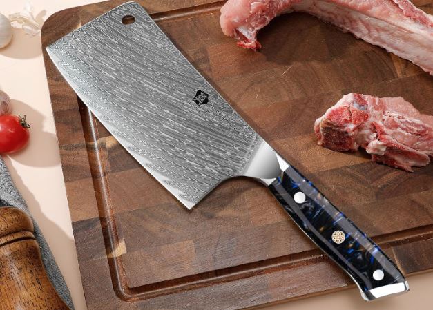 This is the WILDMOK 7 inch Meat Cleaver Knife: a Damascus steel butcher chopper ready for all your cutting needs. It has HRC 60 hardness. It has a triple-riveted resin handle. The blade has 3 layers of stainless steel with a 10Cr15CoMoV core. It is sharpened to 12-14-degrees.