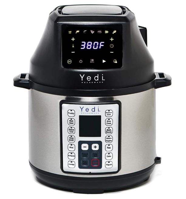 This is the Yedi Tango: an air fryer and pressure cooker with 11 functions. It can pressure cook, slow cook, air fry, saute, steam, and dehydrate your food. It comes with 2 egg racks & streaming trivets, a frying basket, and other neat accessories. It has a convenient display that you can use to increase/crease time and temperature. It also has a delay start function.